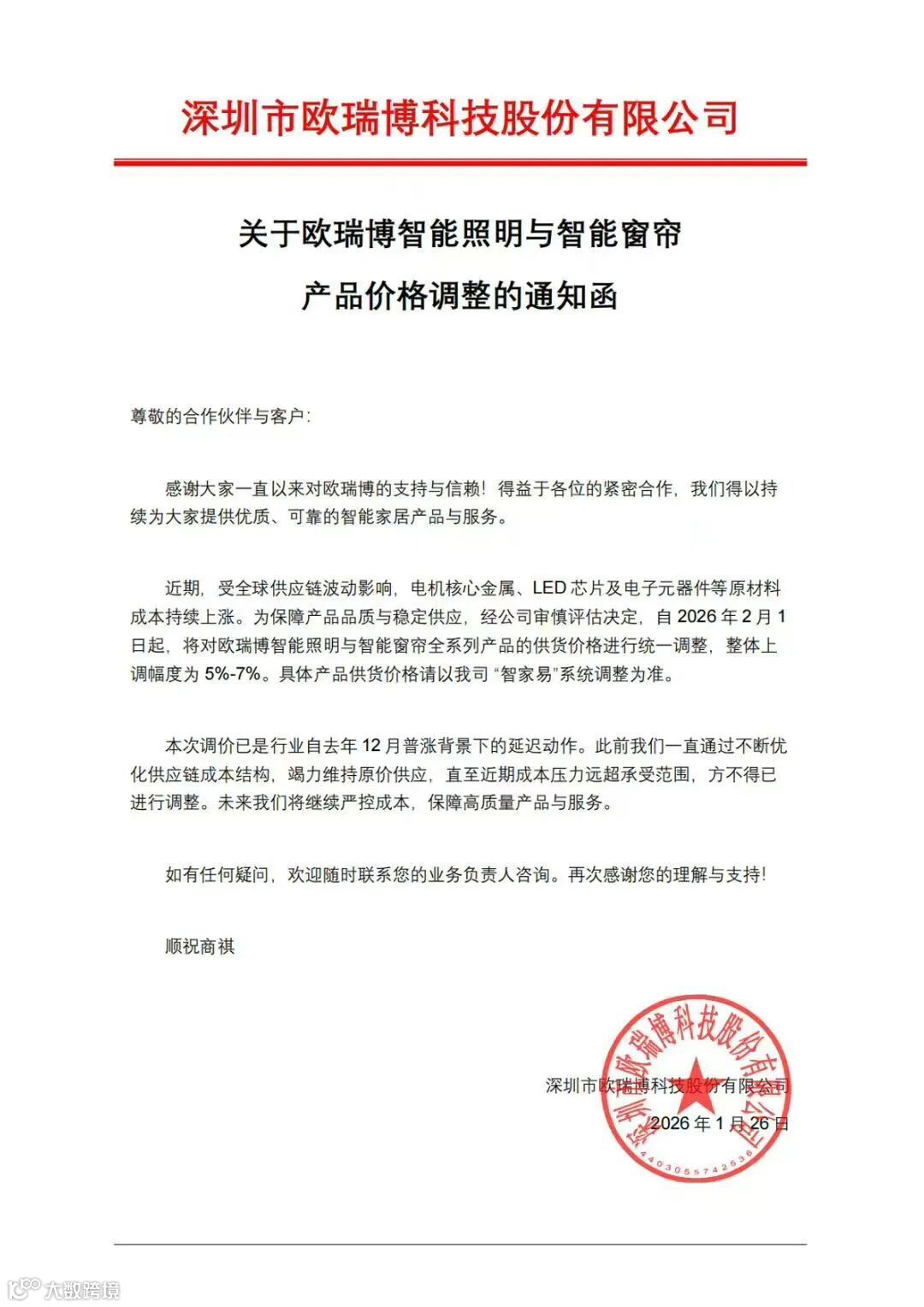 国家级专精特新“小巨人”企业欧瑞博于1月26日率先宣布调价,成为智能家居领域的代表之一。受电机金属、LED芯片及电子元器件等原材料上涨影响,公司决定自2026年2月1日起对智能照明与智能窗帘全系列产品供货价统一上调,整体涨幅5%-7%。