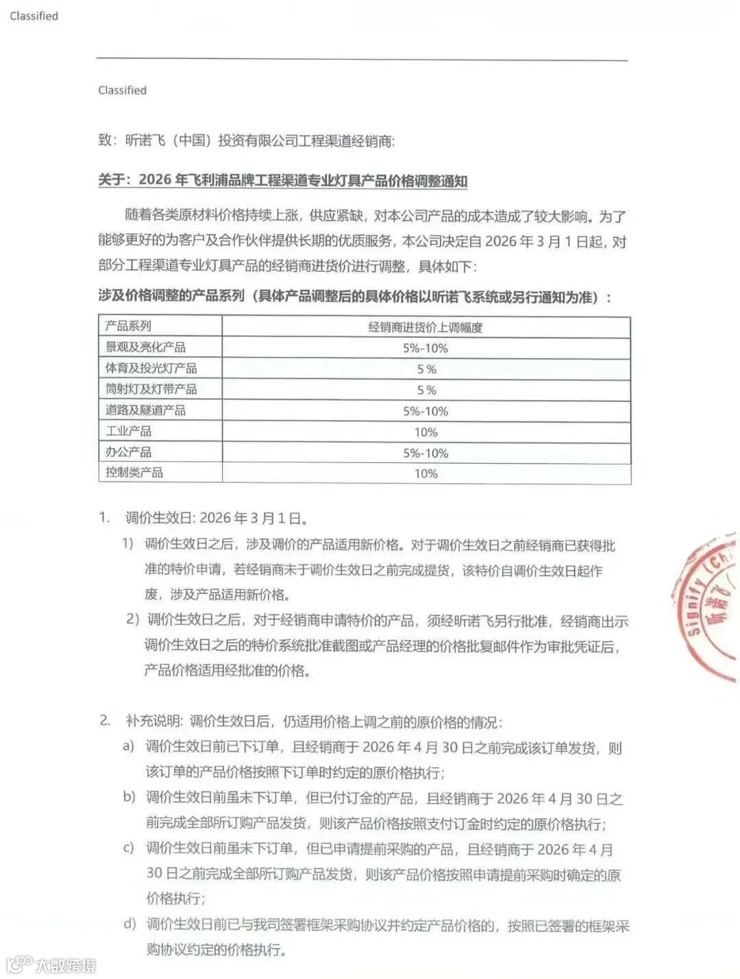 同时,公司还发布了面向工程渠道经销商的专项调价通知,扩大覆盖范围。其中,景观亮化、道路隧道、办公类产品上调5%-10%;体育投光灯、筒射灯、灯带上调5%;工业及控制类产品上调10%。通知中特别明确了订单执行的过渡安排,为经销商备货预留缓冲期。