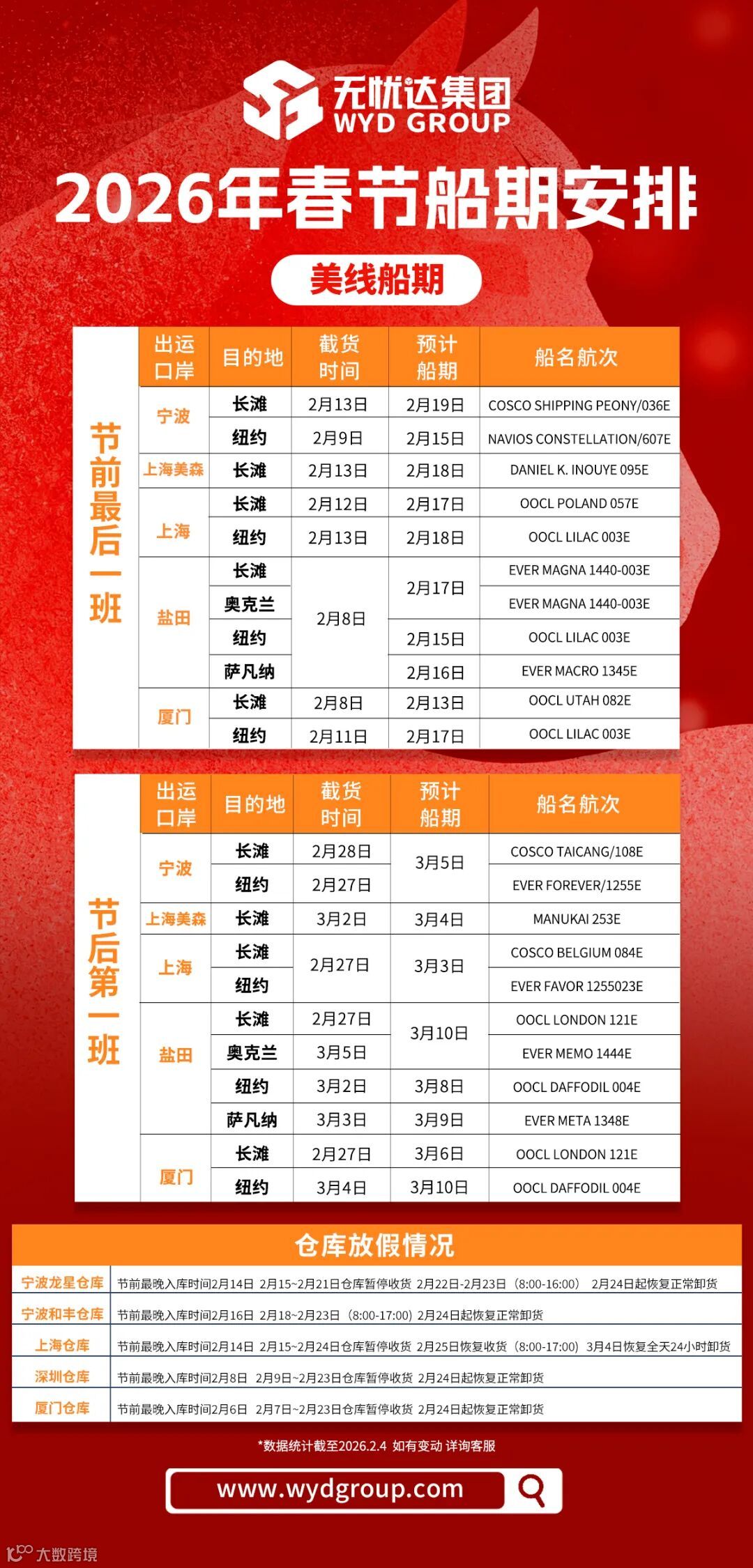 请广大卖家及时保存最新船期信息,合理安排出货节奏,避免因舱位调整影响物流时效。感谢您的理解与支持,预祝新春愉快,生意兴隆!