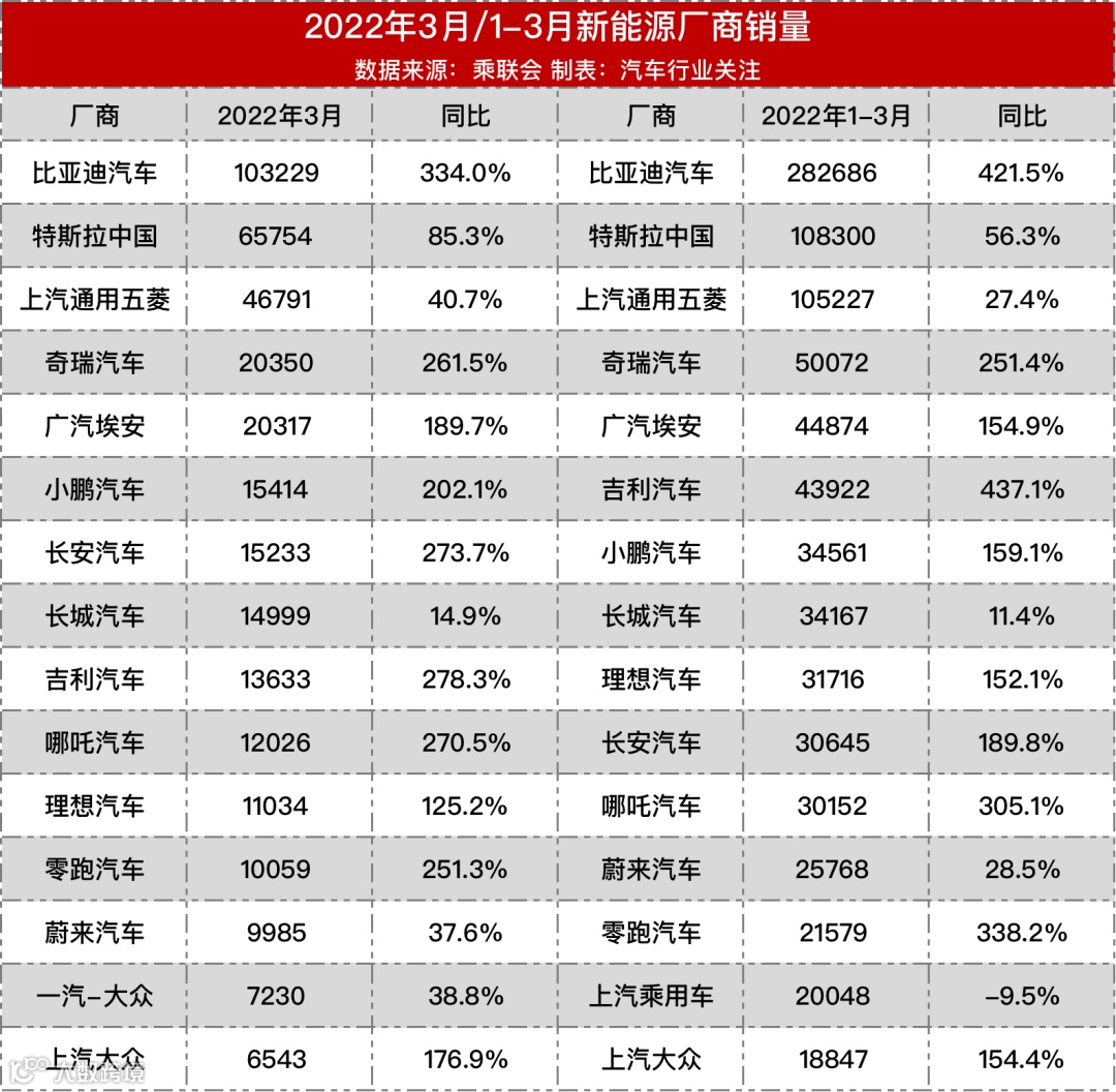 备受疫情和零部件供应影响的汽车业,新能源汽车却丝毫不受影响。据乘联会公布最新零售数据显示,2022年3月国内狭义乘用车市场销量157.9万辆,同比下降10.5%,环比增长25.6%,其中新能源乘用车为44.5万辆,同比增长137.6%,环比增长63.1%。