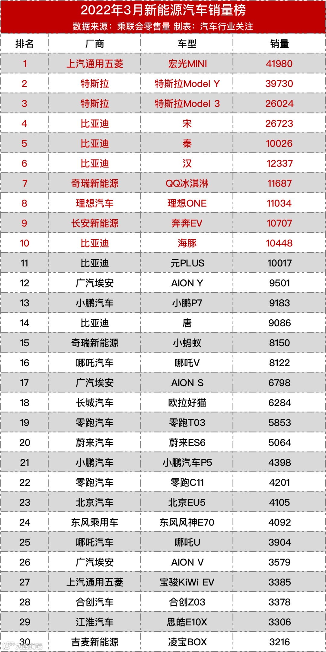 根据汽车行业关注统计,2022年3月新能源汽车销量排名前三车企分别是比亚迪汽车、特斯拉中国和上汽通用五菱,销量分别为103229辆、65754辆、46791辆,三家车企占新能源汽车市场48.5%份额。此外,虽然奇瑞新能源、广汽埃安、长安汽车、吉利汽车等所占市场份额不大但均实现暴涨,而小鹏汽车、理想汽车、哪吒汽车、零跑汽车等新势力品牌表现也十分亮眼。至于合资品牌,仅一汽大众和上汽大众出现在榜单中,在合资品牌中表现较为优异,但是对比自主品牌仍有不小的距离。从数据来看,销量突破万辆的厂商共12家,仅特斯拉为外资品牌,其余均为自主品牌。