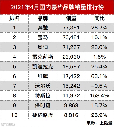 4月豪华品牌销量榜单公布,特斯拉跌至第八