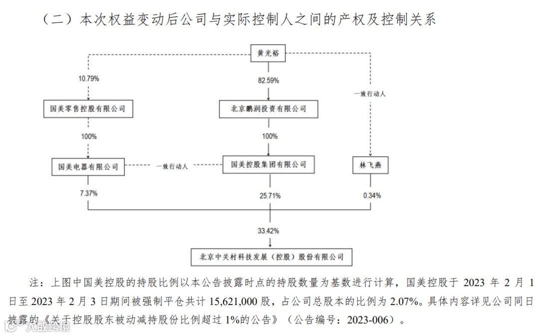 此次权益变动前,黄光裕通过国美控股及国美电器间接持有的公司股份比例为 35.15%,为公司实际控制人。但基于告知函所述,黄光裕持有国美零售的股份比例低于30%,这也意味着当前黄光裕对国美电器不再构成间接控制关系。