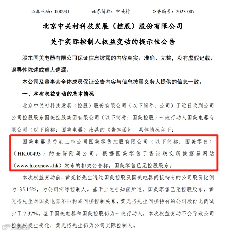 近日,北京中关村科技发展(控股)股份有限公司发布公告,根据国美零售于香港联交所披露易网站发布的相关公告称,国美零售已无控股股东。