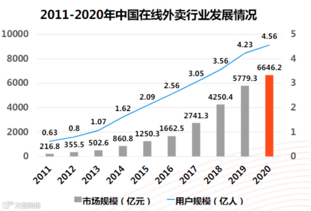 2020年,全国餐饮收入出现近十年来首次下降,但外卖市场的规模却逆势增长,达到了6646亿元,相较2019年增加了866.9亿元,同比增长了15%,且一直保持增长趋势。