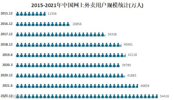 同时,外卖的用户规模也出现了大幅增长。截至2021年年末,中国外卖用户规模已经达到5.4亿人,比上一年同期增加了1亿人。外卖市场的商家注册量也在2021年便达到了140多万家,同比增长超80%。