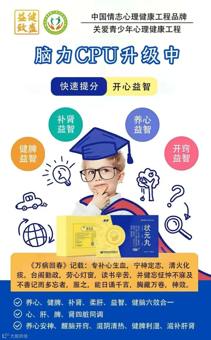 以“中国情志心理健康工程”项目为主体,将情志疾病细分为三大主营体系,其中包括以“小儿脾健灵糖浆”为核心主品的中国情志心理健康工程品牌·小儿神经心理生长发育迟缓项目,主营情志病儿科线;以 “速笑·状元丸”为核心主品的中国情志心理健康工程品牌·关爱青少年心理健康项目,主营情志病青少年学生群体线;以“安神镇惊二十味丸”为主品的中国情志心理健康工程品牌·情志心理疾病特色专科项目,主营情志病中老年群体线;项目力致打造三终端情志心理专科品牌,依托于拍立诊专家平台,赋能基层医生,提供情志病的系统化治疗方案,和中国中医科学院中药研究所达成战略合作,让中医回归传统一证一方化,未来如何发挥中医药在心理健康领域的作用,将中医的"情志"理论应用到心理健康的关怀之中是一个国家级的重大课题。益健致盛将与各合作单位共同推动中国情志心理健康工程的发展。造福基层百姓,为大众谋幸福,为健康中国添砖加瓦。