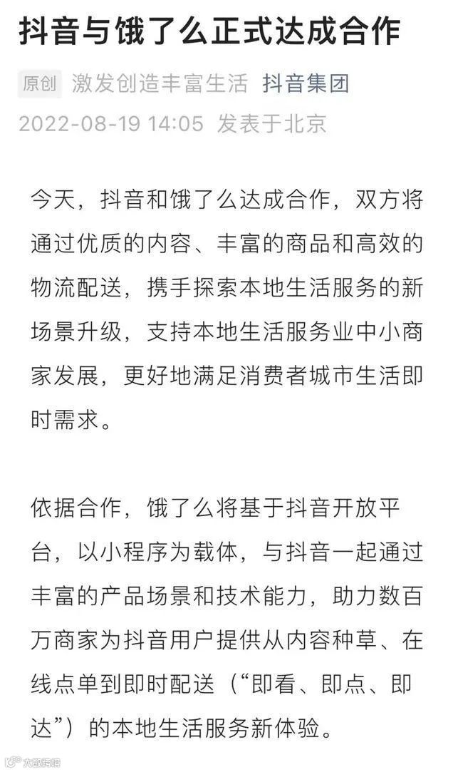 今年8月19日,饿了么和抖音官宣达成合作。双方表示,将携手探索本地生活服务的新场景升级,在视频化时代带来“即看、即点、即达”的本地生活新体验。