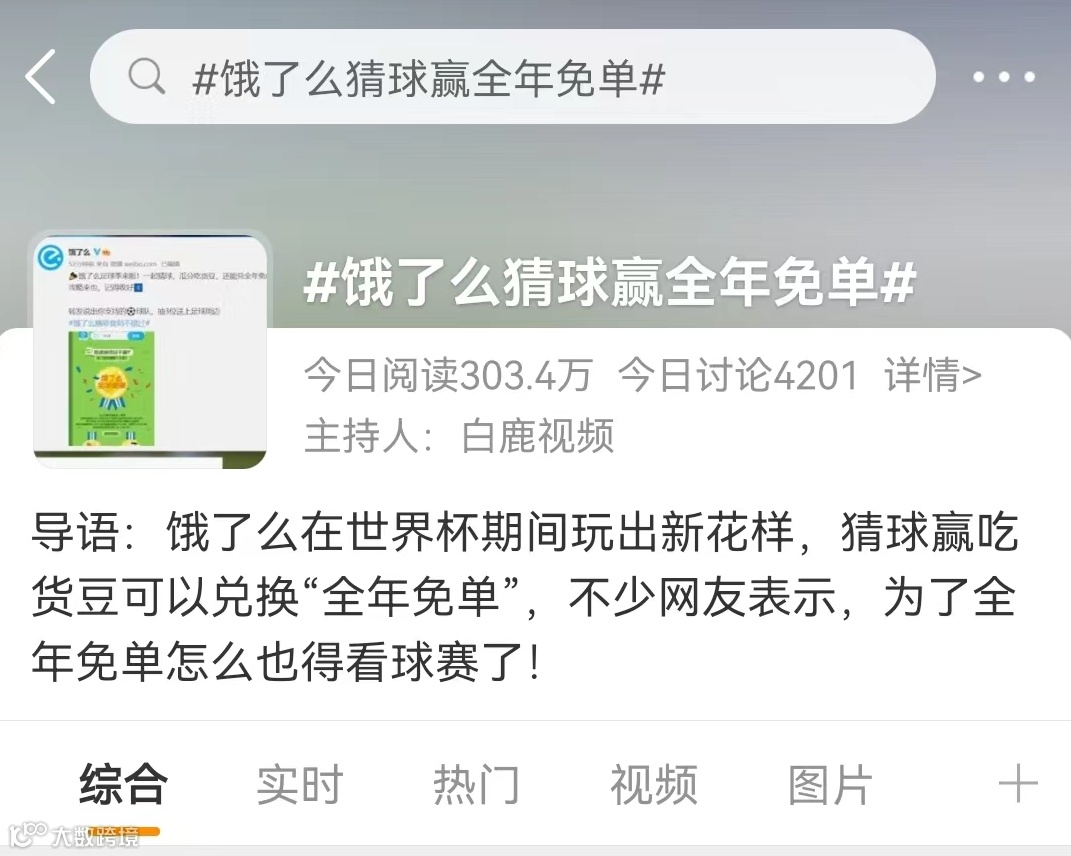 截止发稿前,#饿了么猜球赢全年免单#的话题在微博上已经有1.7亿的阅读量,今日截止发稿前,也有303万的阅读量,甚至有不少网友表示,“为了全年免单怎么也得看球赛了!”