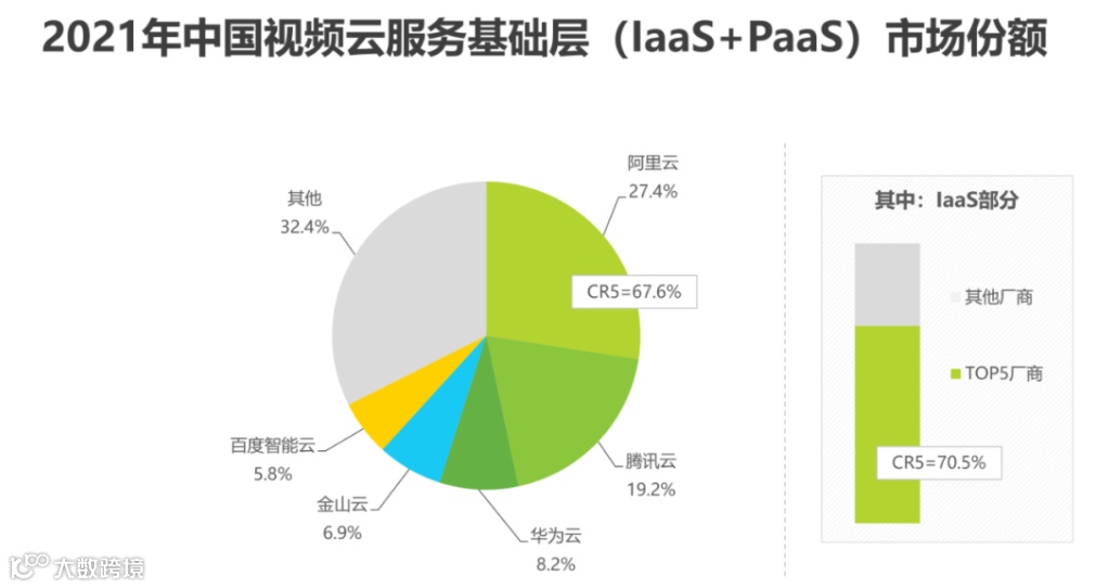 相关研究报告显示,2021年,中国视频云服务基础层(IaaS+PaaS)领域头部五家厂商分别为阿里云、腾讯云、华为云、金山云和百度智能云,五家厂商的市场份额合计为67.6%。