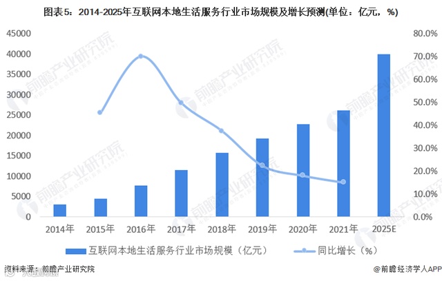 有关数据显示,2021年国内本地生活服务市场规模为2.6万亿元,到2025年将会增长至4亿元。