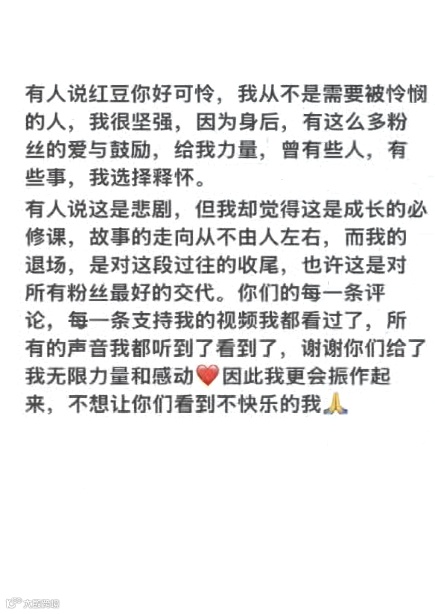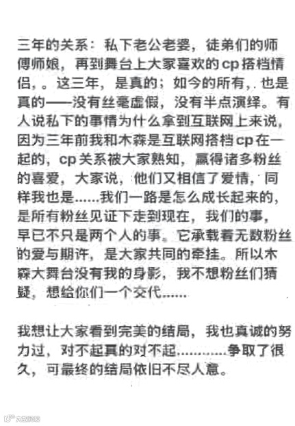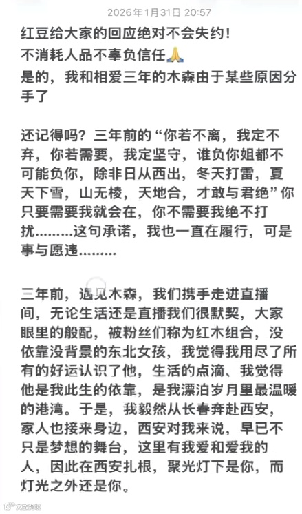 前日,木森与红豆各自发布长文,正式为这段三年的感情画上句点。木森直言分手系自身原因,细数二人并肩作战的珍贵过往,愿回归朋友身份,各自专注事业;红豆则感慨木森大舞台三年的点滴过往满是不舍,坦言这段感情毫无演绎成分,虽结局留有遗憾但已选择释怀,同时也感谢了粉丝一路以来的陪伴与支持。
