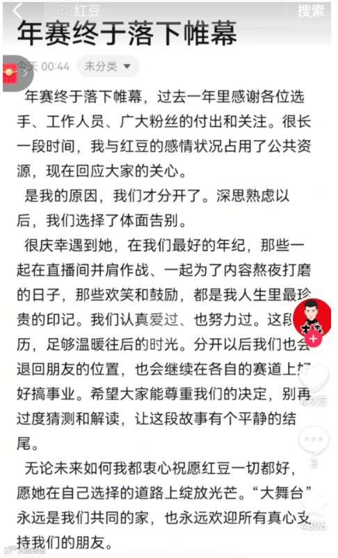 二人自2020年相识并开启合作,打造的木森大舞台火遍全网,线下形影不离、线上互动亲密,更是被粉丝亲切称作“森豆CP”。而此次分手早有端倪,此前红豆便因木森与新搭档亲密互动、刻意疏远自己心生隔阂,也让二人的感情矛盾彻底摆上台面。