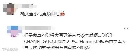 品牌降级风险:有网友直言“小写像山寨”,并举证DIOR、CHANEL等奢侈品牌坚持大写字母的“高级感”,担忧喜茶过度迎合年轻群体而稀释品牌价值;