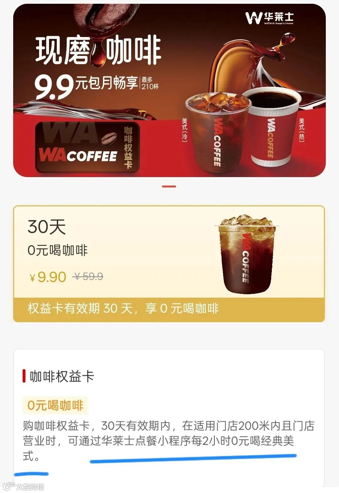 在此基础上华莱士推出了9.9元咖啡月卡,并且需要你到店领取,这说明每一个进店领咖啡的人,都是华莱士门店的潜在客户。
