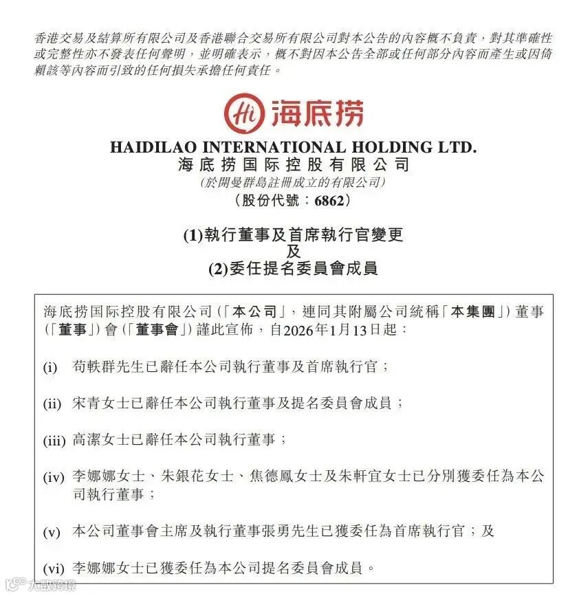2026年1月13日,海底捞国际控股有限公司(股份代号:6862)在港交所发布公告,宣布重大人事调整:创始人张勇再度出任首席执行官(CEO),接替辞任的苟轶群。同时,四名新高管李娜娜、朱银花、焦德凤及朱轩宜获任执行董事,原董事宋青、高洁辞任。此举被视为海底捞在竞争加剧的餐饮市场中,强化核心领导力、推动组织升级的关键一步。