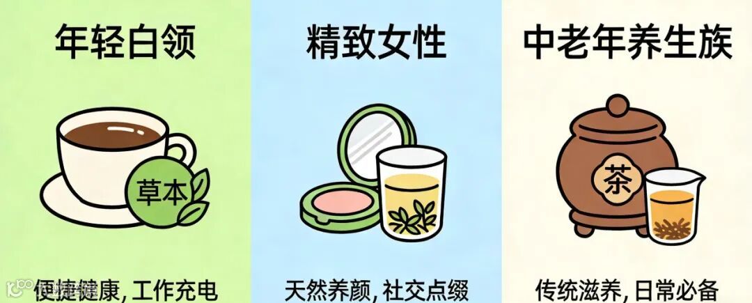 精致女性则更聚焦功效精准性,护眼、美颜、助眠等靶向需求明确,执着于天然无添加的健康属性,既反感夸大功效的伪养生宣传,也很在意产品颜值与社交分享属性,愿意为优质原料买单,但也会顾虑溢价不值,对草本茶与养生茶的概念偶尔混淆。