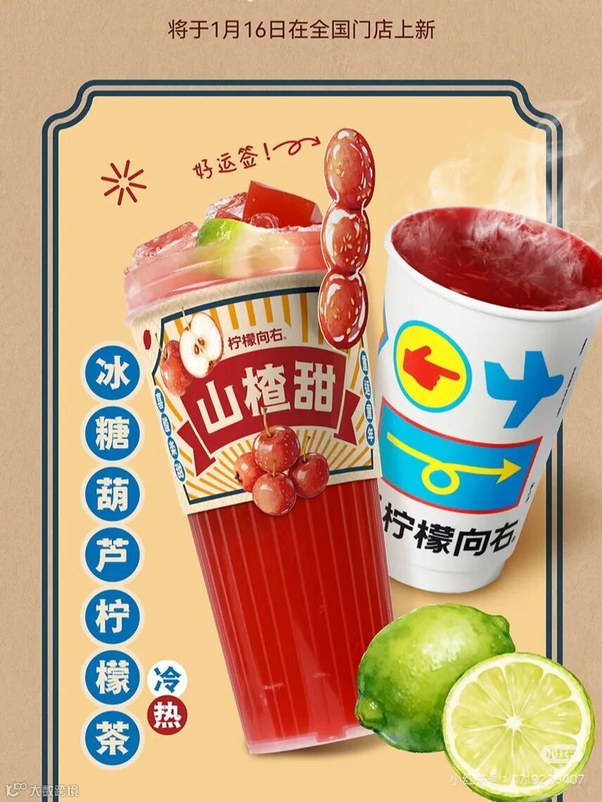 同样柠檬向右在2026年初推出了冰糖葫芦柠檬茶、雪顶奶芙糖葫芦、山楂水晶冻轻牛乳系列液体冰糖葫芦。