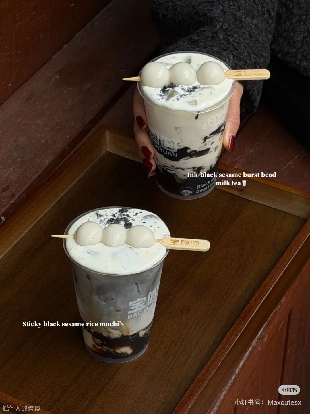 比如液体黑芝麻汤圆,看上去宛如一杯水墨画,而宁波汤圆则成了这杯奶茶的灵魂。