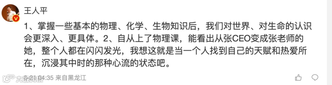 这也与张朝阳的理念不谋而合。他曾提出:如果要追求人生的意义,就要在做好本分的同时,每天做出一些改变、影响一些人或者对社会有一些正面的推动,那你就会更有意义。