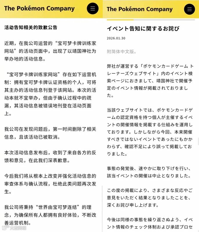1月30日,宝可梦发布中日双语道歉公告,却堪称“灾难级公关样本”。公告仅称“活动不宜举办”“审查疏漏”,对靖国神社的历史敏感性只字未提,中文版勉强塞进“深表歉意”,日文版则通篇回避“道歉”二字。