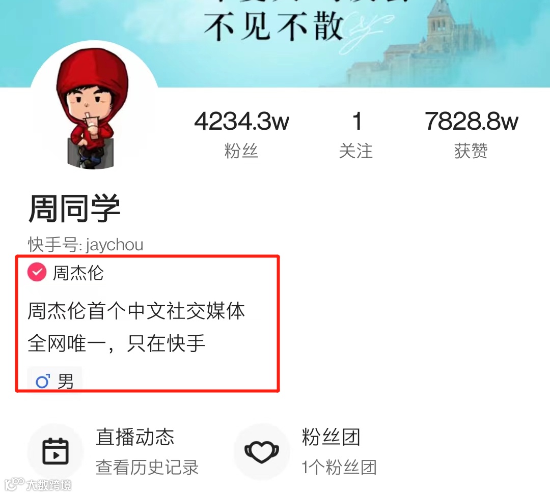 在周杰伦快手账号简介中写着简单的两句话,“周杰伦首个中文社交媒体。”“全网唯一,只在快手。”
