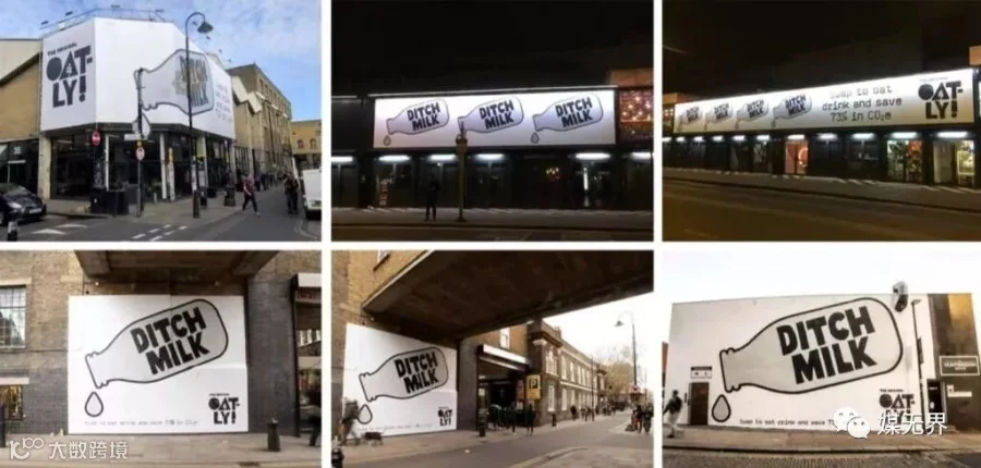为了传达这一信息,Oatly利用了各类户外广告媒介:壁画、广告大牌、海报、数字显示屏等等来进行宣传。得益于户外广告的强大宣传力,这场备受争议的运动一度使英国的乳制品行业陷入困境。