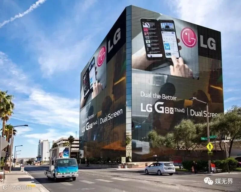 为了宣传最新研发的双屏(Dual Screen)产品LG G8X THINQ,全球知名电子品牌LG霸气承包下了位于美国拉斯维加斯会展中心对面的户外广告位。