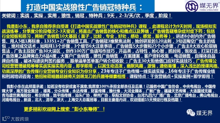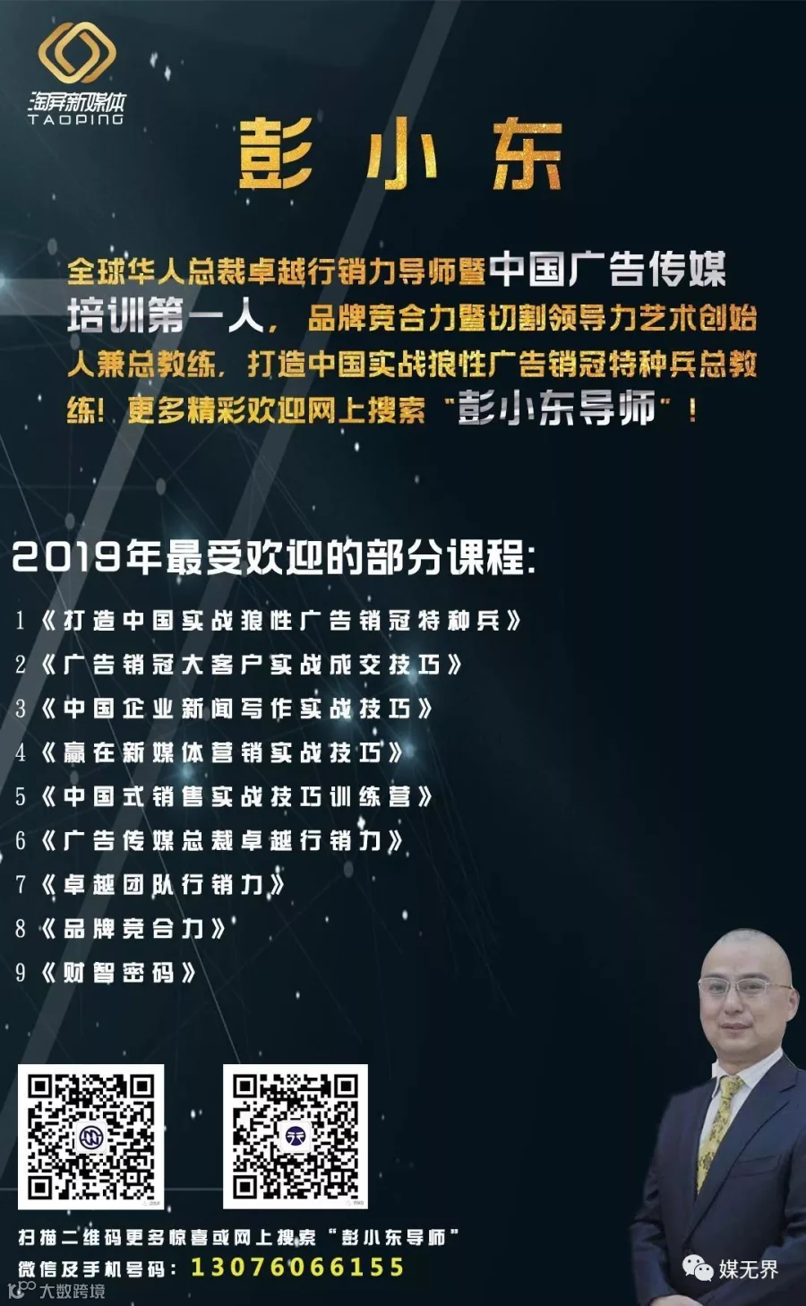 好看的视觉设计、优秀的宣传文案以及脑洞大开的表现创意赋予了户外广告无限的想象空间,我们希望以上这些优秀的户外广告案例能为各位户外广告人带来更多灵感,一条好的户外广告不仅仅能引来更多关注,更代表着一次好的事件营销。这才是真正的广告效果!这才是好的广告!.....(未完待续,版权归彭小东导师所有,违者必究!观点言论文章均来自彭小东导师授课内容整理或网络,若有侵犯到个人所属权,请联系删除,谢谢!关注媒无界微信公众号并查看历史消息,更多原创实战干货精彩分享!欢迎转发,敬请注明作者及出处,更诚挚的邀请您亲临彭小东导师《品牌竞合力》及《打造中国实战狼性广告销冠特种兵》(2020年3.0升级版)课堂聆听彭小东导师现场原创实战实操干货精彩分享及演讲还将免费获赠广告销售百问百答!!