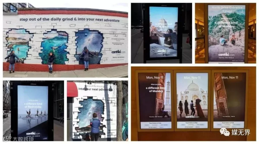 孔蒂基旅行社(Contiki tours)致力于为18-35的青年人群打造半自助式的旅游体验,为了更好地宣传公司的服务定位,孔蒂基将目光锁定在了波士顿和芝加哥的的青年人群,在波士顿、芝加哥的大学内放置了许多充满互动感的广告牌。