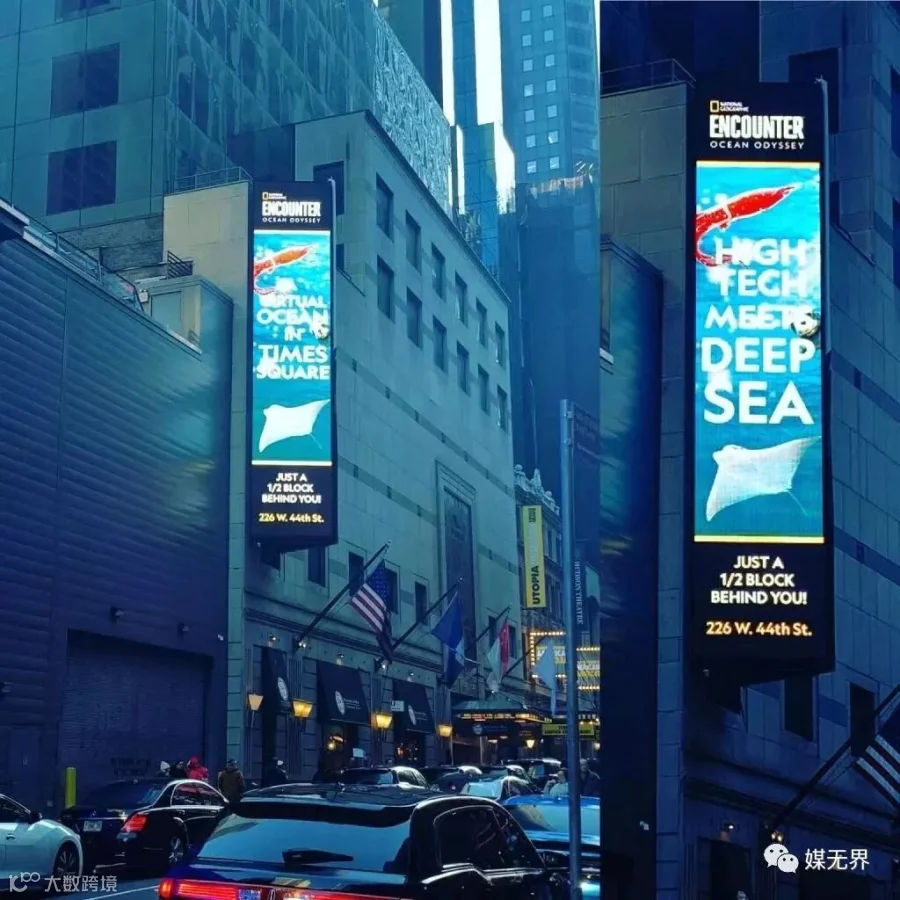 为宣传在时代广场举行的“海洋冒险之旅(Encounter ocean odyssey)”奇幻科技展,美国国家地理杂志首选依旧是户外广告。与当年的静态海报不同,这次国家地理杂志选择了利用千禧酒店前的数字户外广告大牌搭配生动画面来进行宣传。