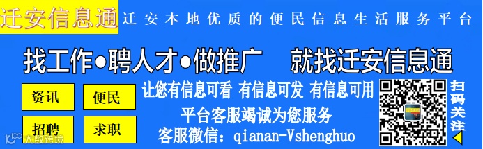 【迁安信息通】是迁安本地优质的便民信息-生活服务平台,为您提供迁安本地最新的热门资讯,本地便民信息互通共享,信息发布等服务,包括招聘求职信息,供求百帮信息,生活服务信息等各类便民信息,我们平台的宗旨就是:让您有信息可看,有信息可发,有信息可用,来实现我们之间互帮互助,信息互通,合作共赢的网络空间!平台除了每天公众号推送信息之外,还有平台专属人工客服,现微信粉丝4700+,如果您想发布任何信息,或者有任何问题需要咨询,都可以直接添加客服微信,客服将第一时间为您服务!客服微信号:qianan-Vshenghuo