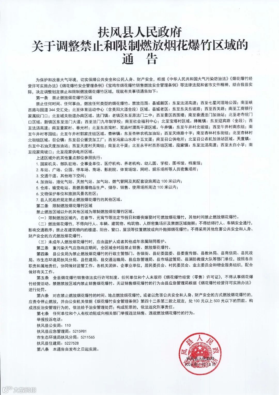 禁止任何时间、任何事由,燃放任何类型的烟花爆竹。禁放范围:县城新区:东至法汤高速;至七星河湿地公园;南至峡西路与国道344交汇处;北至体育运动中心(含美阳大道全段)区域。县城老区:东至东关东坡路;西至西关路;南至工商银行家属院门口;北至城关街道办南区域。法门镇:老镇区东至原法门二中;至景区西围墙;南至秦通法门加油站;北至老寺院门口区域。新镇区东至法门大道;西至法门九年制学校;南至社会福利中心;北至宝塔村区域。绛帐镇:东至迎宾路(全段);至法汤高速;南至董家村、春光村;北至东西湾村、双庙村渭高干渠区域。午井镇;东至午井村北坡组;西至午井村南东组;南至午井村枣园组;北至午井村郭家庄组区域。杏林镇:东至杏林农机加油站;西至天绛路十字;南至杏林村东街组;北至杏林村北街组区域。召公镇:东至召公酱货加工厂;西至冯家山水库十五支渠;南至召公供电所;北至召公农机加油站区域。天度镇:东至中石油天度加油站;西至天度村天南组;南至北干渠;北至永平村苏组区域。段家镇:东至法汤高速;西至太白小学;南至段家南坡口;北至段家供电所区域。
