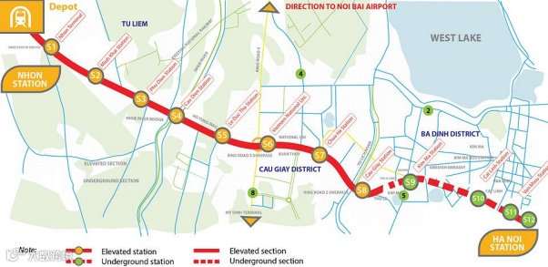 该线路全长12.5公里,起于Nam Tu Liem区的Nhon站,终至河内火车站,共设12座车站。其中高架段长8.5公里,设8站;地下段长4公里,设4站。项目符合河内市2030年交通规划及越南2050年远景发展目标。
