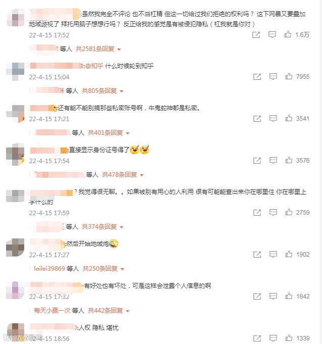 值得一提的是,各大平台将强制显示IP所属的消息公布之后,很多人都非常支持这一功能,但也不少人担心,这一项目无法手动关闭,是否侵犯了用户的隐私?同时,展示IP地址之后,会不会导致骂战升级,延伸到地域攻击上,引发更多的矛盾呢?