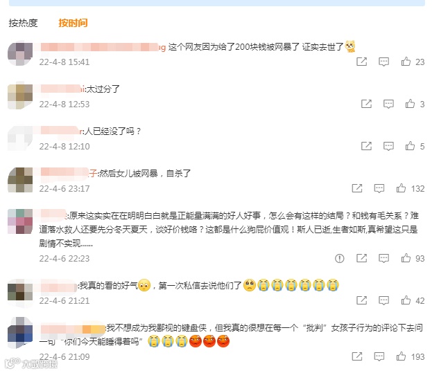 这本来是一件温暖、正能量的事情,但在网上传开之后,该女士却遭到了网络上的谩骂,因为一些键盘侠质疑这位女士打赏的200元太少,不久之后,这位女士就坠楼身亡。据其丈夫称,该女士本就胆小善良,遭遇网暴之后情绪失控跳楼,将会用法律手段,追究网暴者的责任。