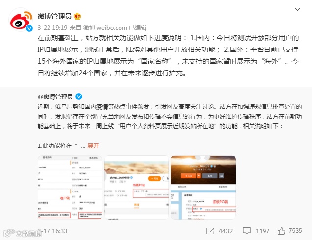 从微博管理员发布的消息来看,微博将在用户个人的资料页,展示该用户近期的发帖所在地,之所以推出这项举措,最直接的原因,是俄乌战争期间个别用户冒充当地网友,在平台上发布传播不实信息。