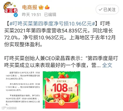 对此,叮咚买菜创始人兼CEO梁昌霖表示:“第四季度是叮咚买菜成立以来表现最好的一个季度,营收实现了高速增长。” 一个季度亏损10亿,却是成立以来表现最好的一个季度,尽显经营叮咚买菜的心酸和不易。