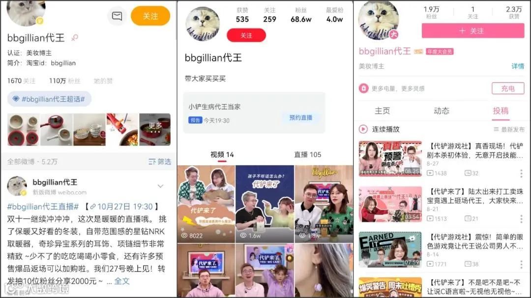 粉丝数量虽然不多,但那一年“双十一”期间,@bbgillian代王与搭档小铲组成的“代铲组合”以黑马之姿,在大促第一天超越众多红人主播,GMV达到近2000多万,热度一度冲至TOP3的位置,甚至因卖断货早早下播,给观众留下了深刻印象。