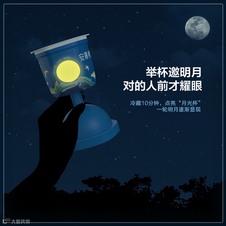 首先,借用《大话西游》IP中“月光宝盒”这一道具,传达思念重逢的情怀,符合中秋要旨,却令人意想不到;其次,点亮酸奶杯上的月亮,应景的同时带来新奇感,不仅能吃还能玩;最后,月饼与酸奶更是传统味道与新口味的结合。