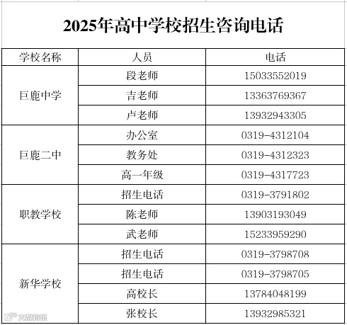 1.巨鹿县职教学校职业高中:最低录取控制分数线为450分。巨鹿县第二中学和巨鹿职教学校组建巨鹿二中教育集团,巨鹿县第二中学普通高中和职教学校职业高中实行一体化管理,实现普职融通,为更多学生创造升入本科院校机会。