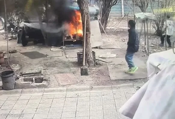 12时35分40秒左右,两个男孩再次来到狗笼外,共同点燃一支烟花,这时狗笼内的烟稍大,他们观望后没有再将烟花扔进笼内。随后,黑衣男孩开始拿着烟花去追一只鸡,白衣男孩在狗笼外观察后大叫“着火了”。12时37分,狗笼内开始有浓烈的黑烟升起,不久烈火将笼子吞噬。