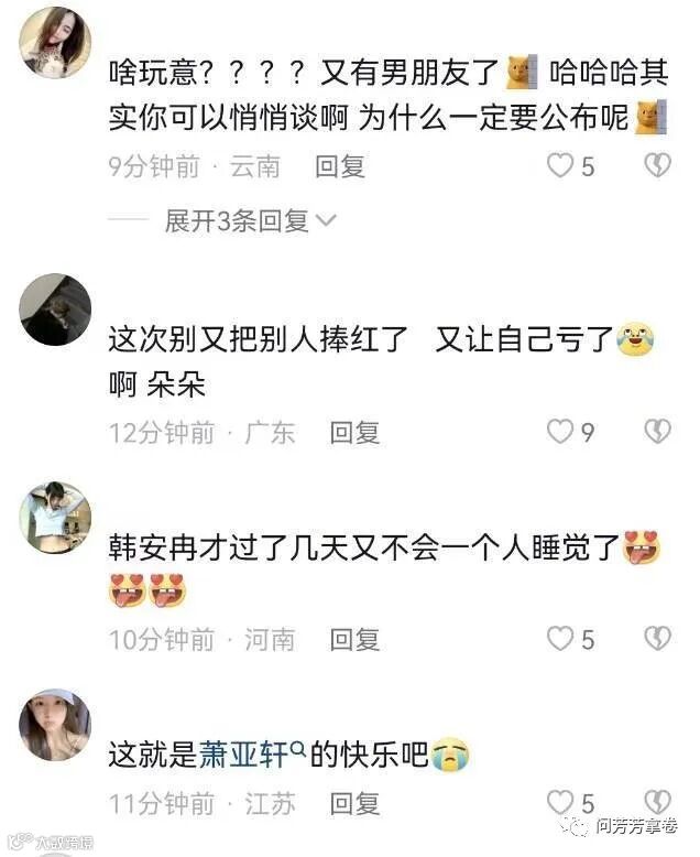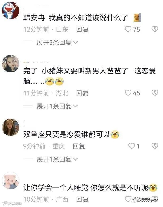 网友可谓是很吃惊,不过也是在意料之中的事情。网友评论道:韩安冉,我真的不知道该说什么了,小猪妹又要叫新男人爸爸了,这恋爱脑,才过几天,又不会一个人睡觉了。