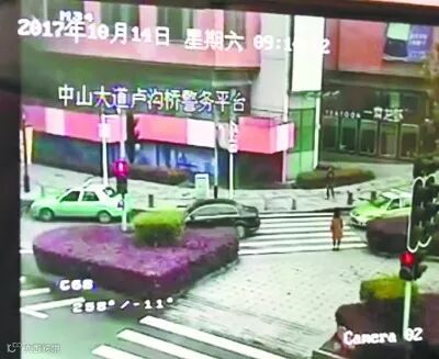 记者从事发现场的监控视频看到,2017年10月14日9时14分,中山大道芦沟桥路路口处,一名女性行人正准备过斑马线,随即看到一辆黑色轿车驶来,并未让行,女子停下脚步,待3台车依次通过后,才走斑马线过路口。当时,王先生的轿车处于3台车中的第二台,是唯一被抓拍到不礼让行人行为的一台车(见下视频截图)。