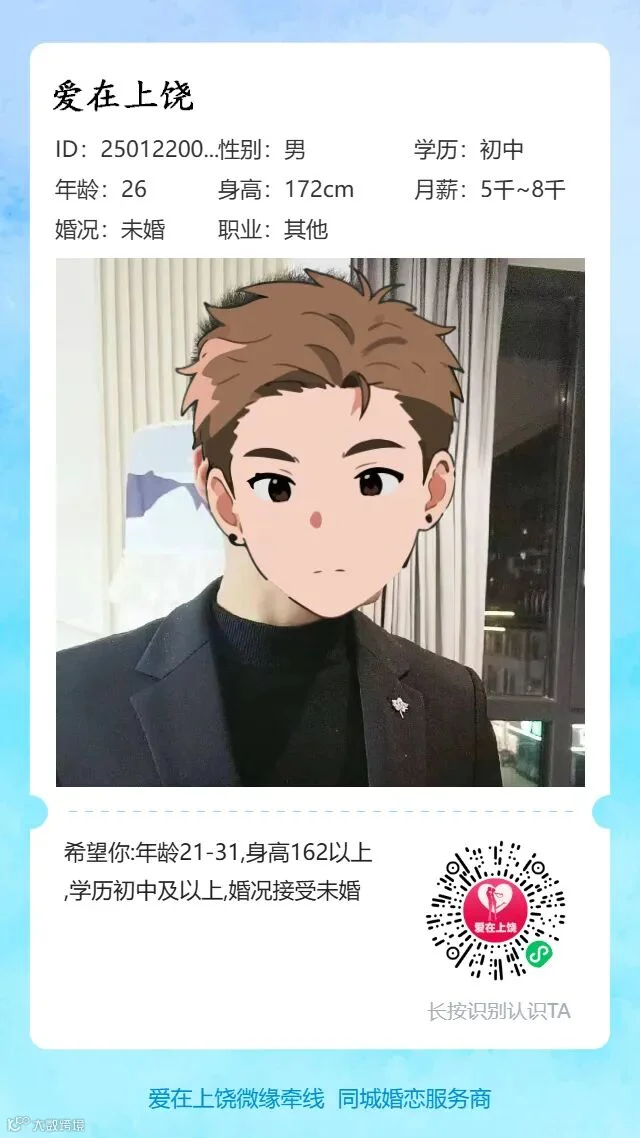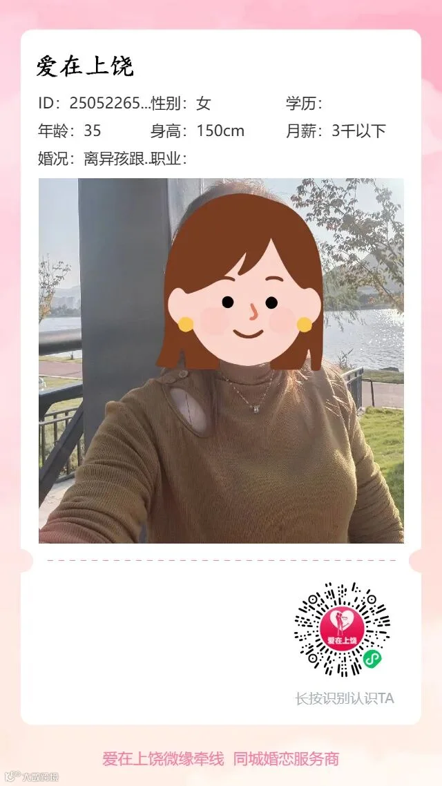 个人情况:铅山人,在浙江电子厂工作,月收5000左右。离异小孩归对方,弟弟妹妹已成家。