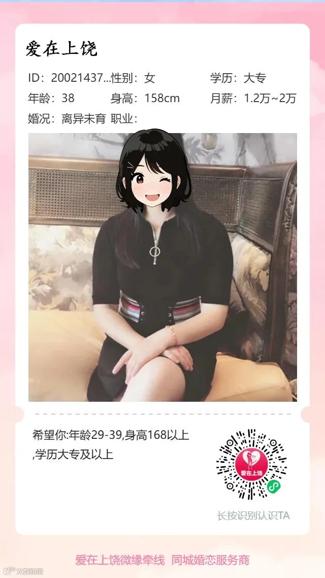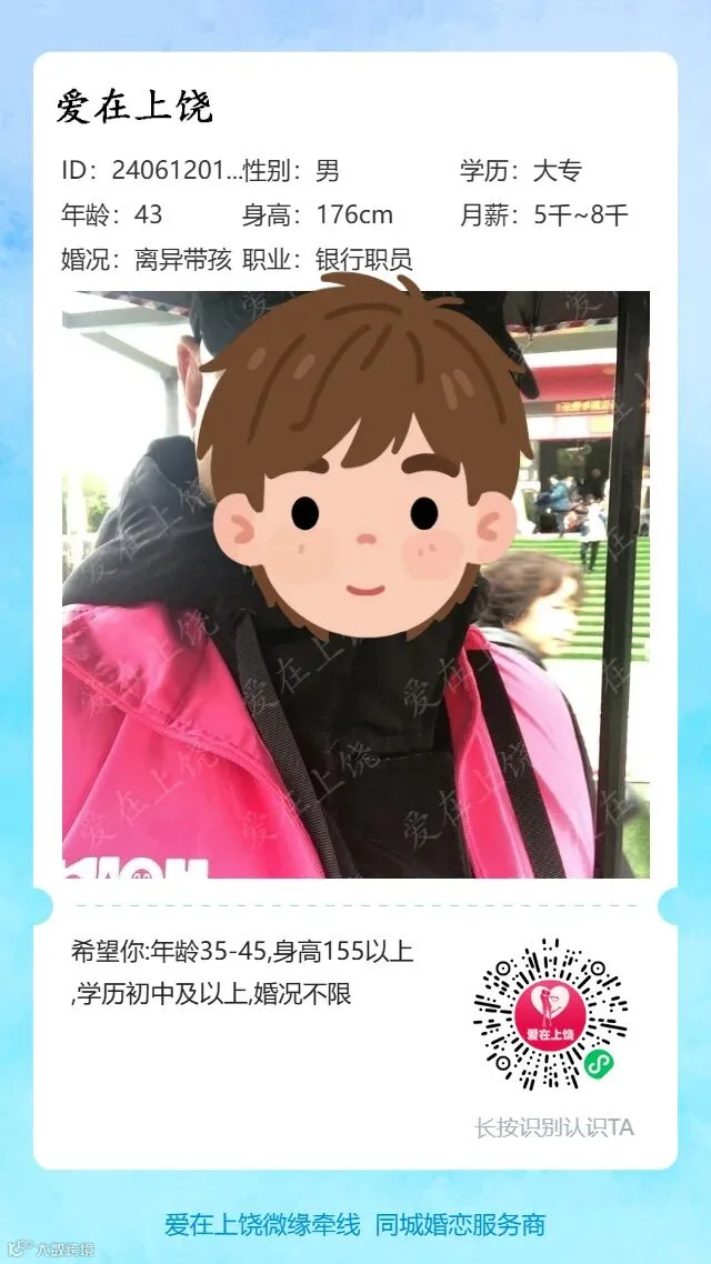 个人情况:铅山人,银行工作,已购车,县城有自建房。独生子,自己有个女儿,母亲已退休。