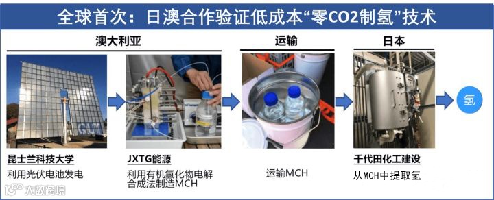 2019年3月,日本JXTG能源公司、千代田化工建设公司及东京大学与澳大利亚昆士兰科技大学合作,在全球首次成功验证了先在澳大利亚低成本制造有机氢化物后,然后再在日本提取氢的技术。