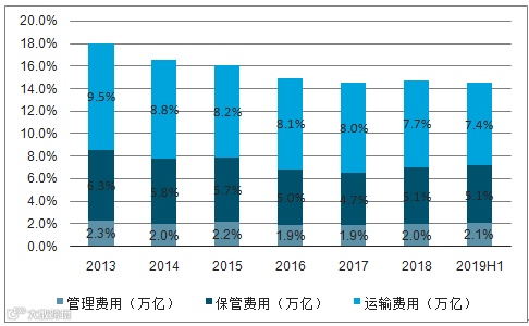 图:2013-2019上半年中国社会物流费用与GDP比率