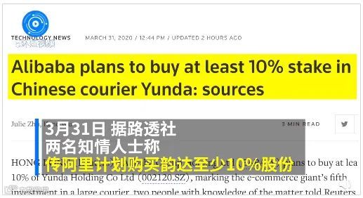 3月31日,据路透社报道:阿里巴巴正计划收购韵达至少10%的股份。