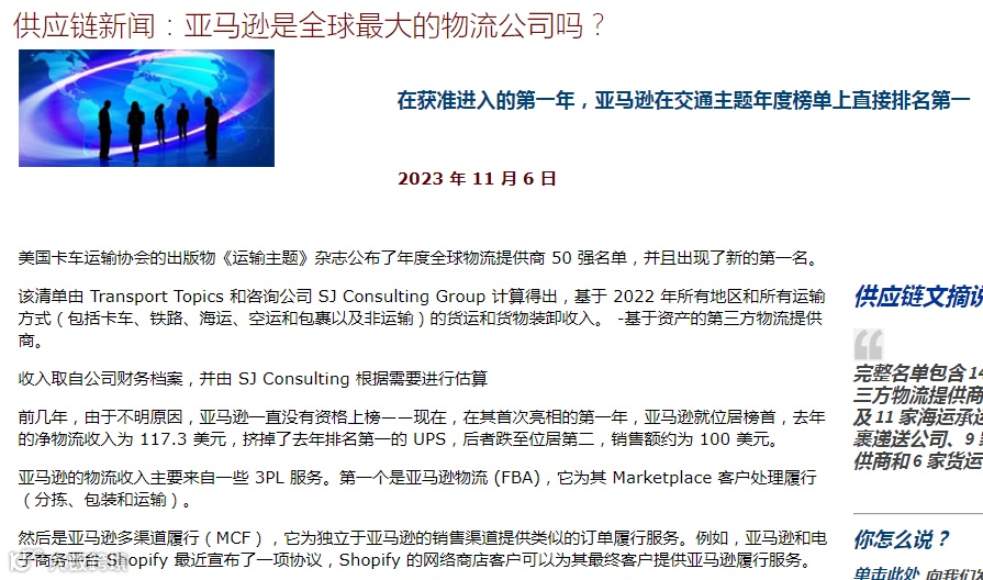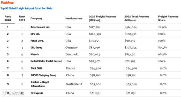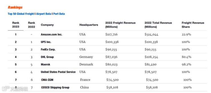但让人意想不到的是,今年该榜单决定将在线零售巨头亚马逊也纳入其中。而作为首次亮相的“新选手”,亚马逊凭借着去年来自第三方卖家服务(含 FBA服务收入)的1177亿美元净销售额,顺利超越UPS、FedEx等巨头,成为2023年全球货运企业50强排行榜的榜首。